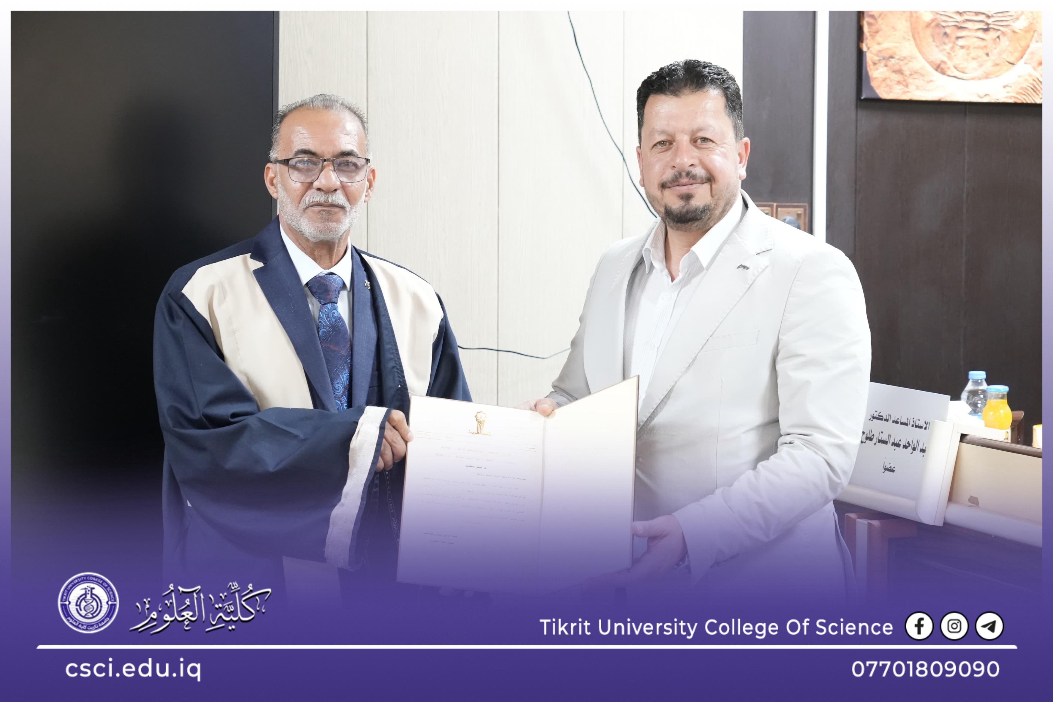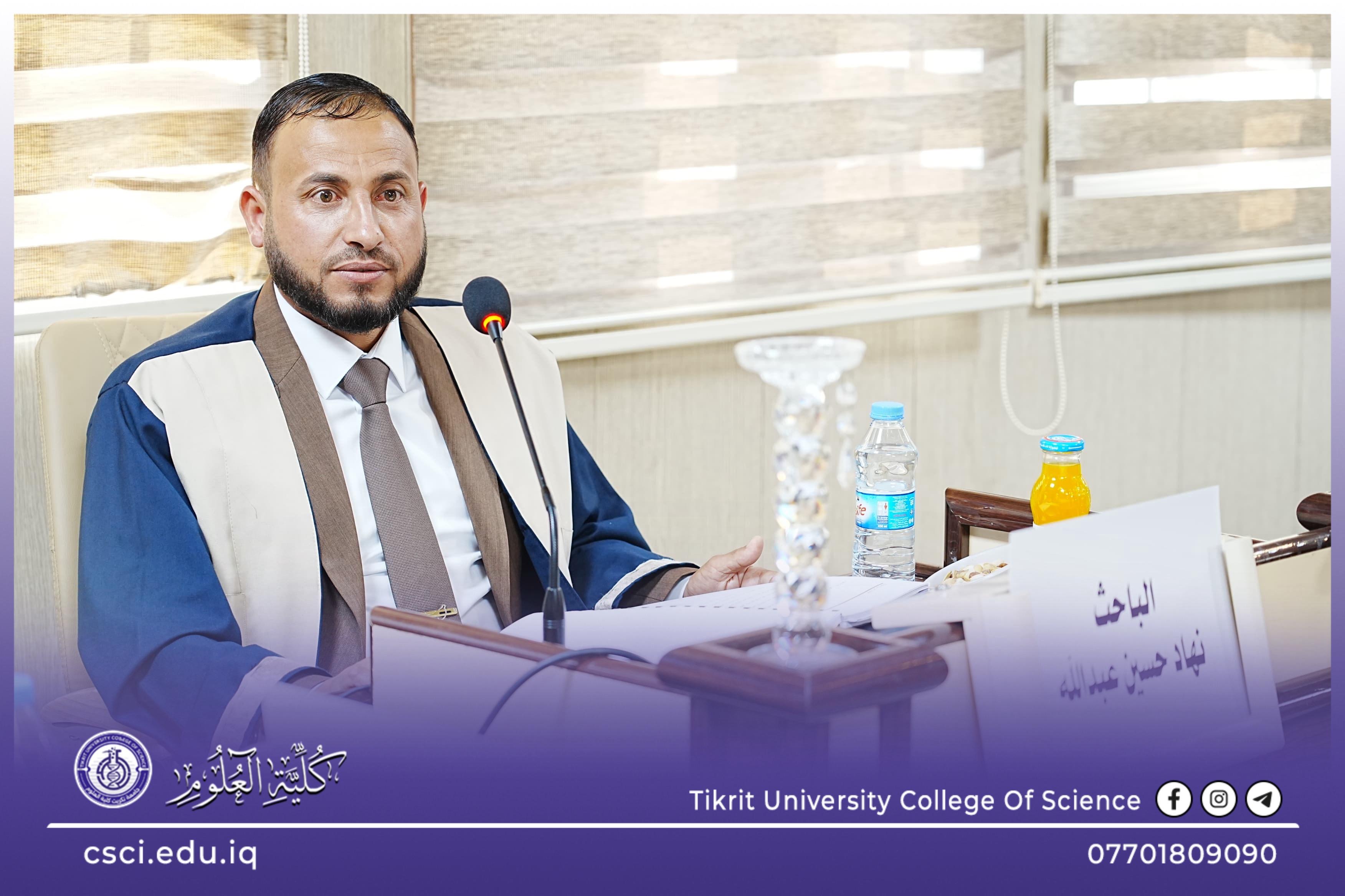 نجح الباحث "نهاد حسين عبدالله العوين"، الطالب في قسم الكيمياء بكلية العلوم بجامعة تكريت، في نيل درجة الدكتوراه بتقدير عالٍ عن أطروحته الموسومة: "تحضير وتشخيص مركبات قرصية بلورية سائلة جديدة، دراسة خصائص النانو، الالتحام الجزيئي وتطبيق الفعالية البيولوجية لها