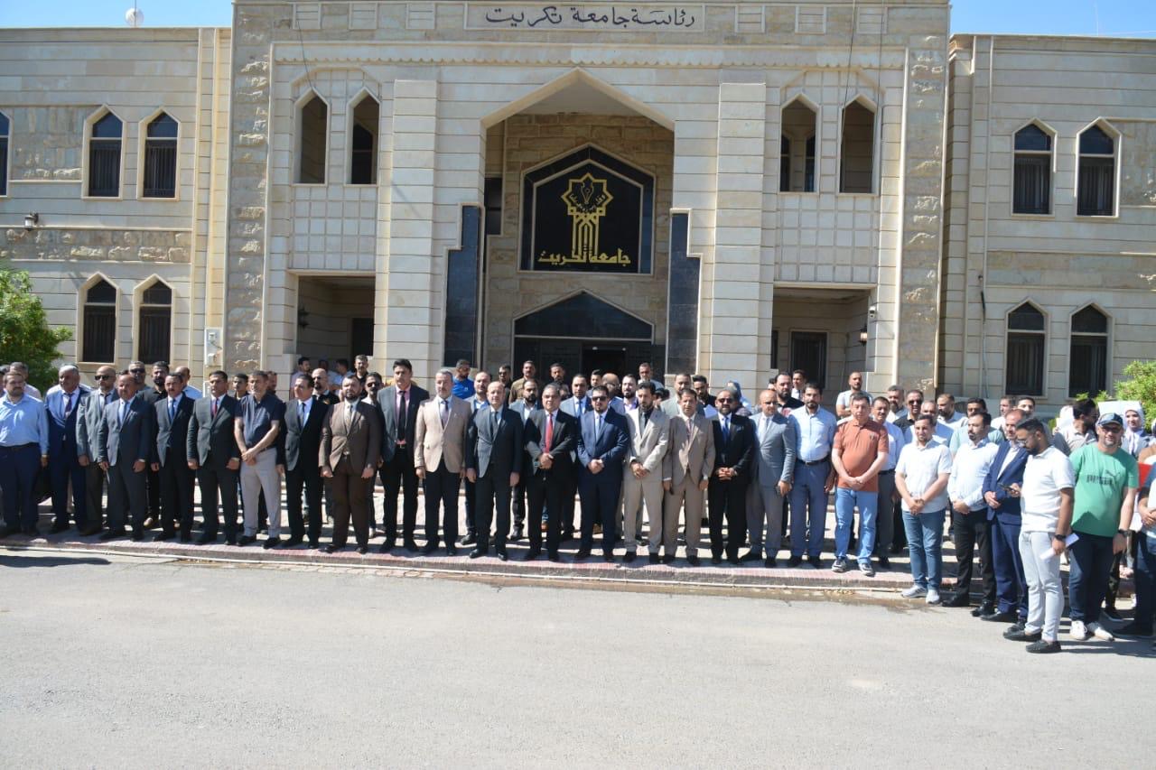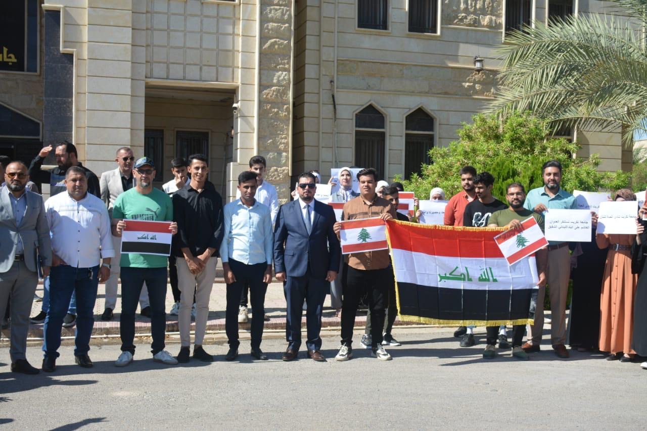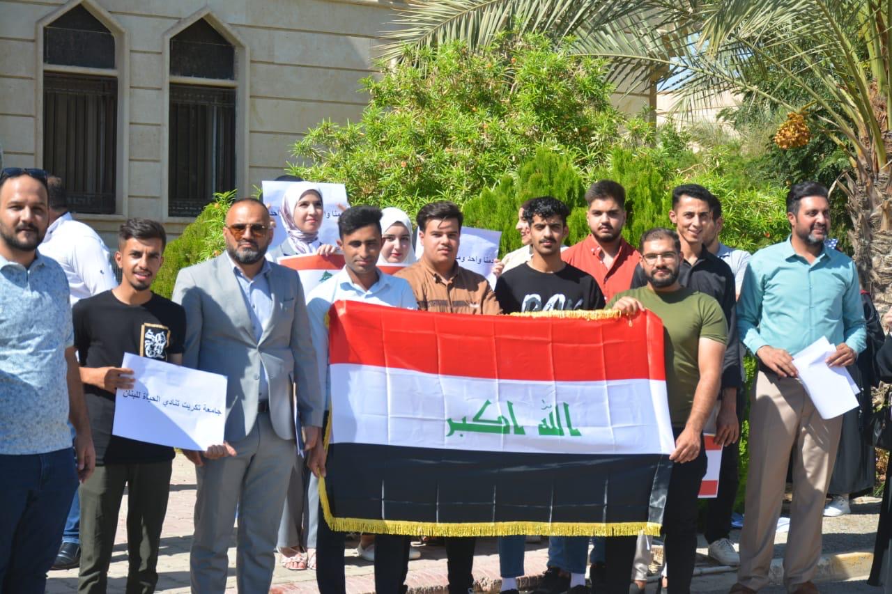 تنفيذا لتوجيهات وزارة التعليم العالي والبحث العلمي نظمت جامعة تكريت بحضور الاستاذ الدكتور وعد محمود رئيس جامعة تكريت والاستاذ الدكتور حسن حسين ابراهيم مساعد رئيس الجامعة للشؤون العلمية وعدد من السادة عمداء الكليات والموظفين والطلبة وقفة استنكارية واحتجاجية ضد العدوان الهمجي الذي يتعرض له الشعبين الفلسطيني واللبناني الشقيقيين على يد قوى الاحتلال والظلام