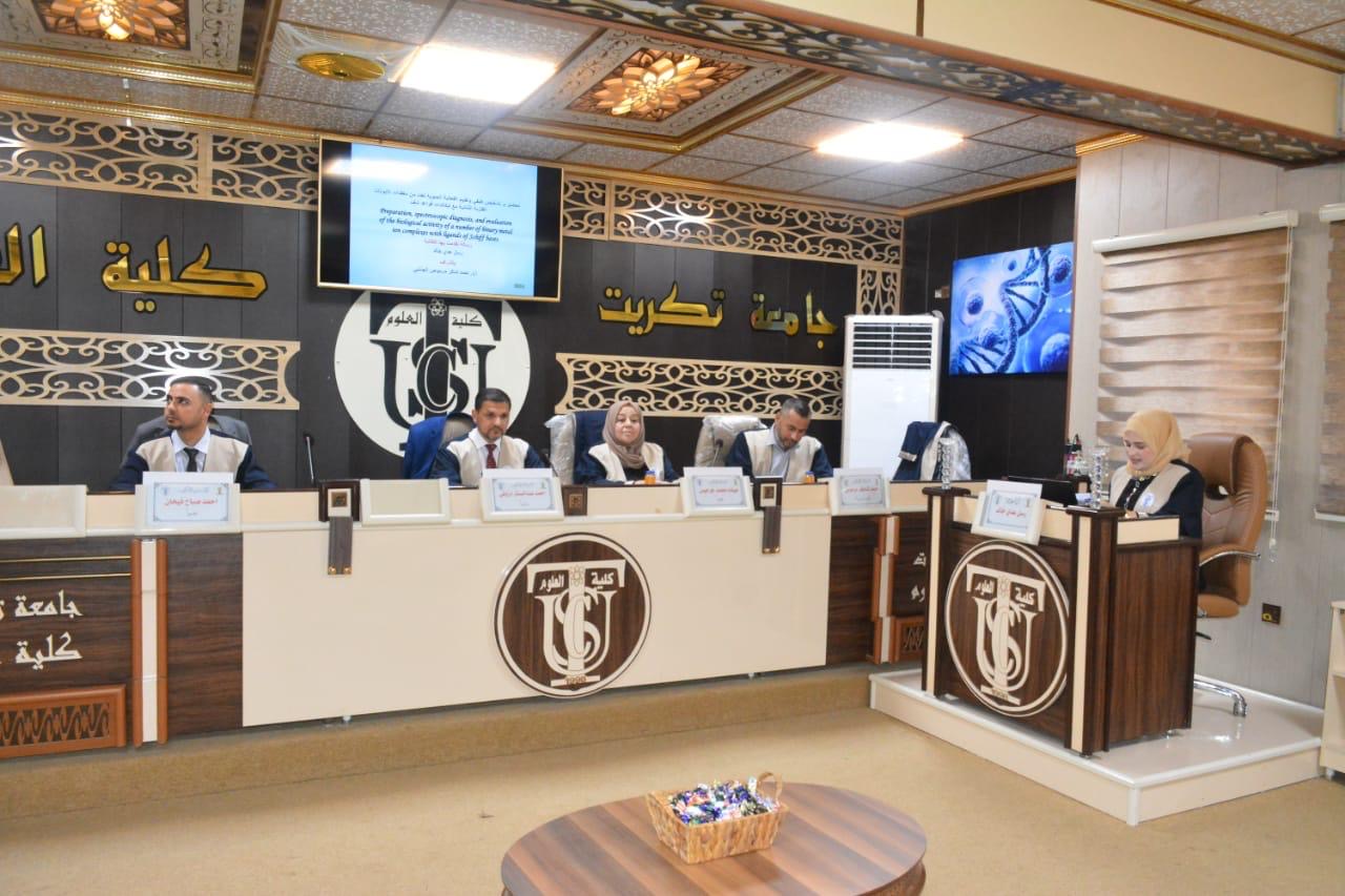 نوقشت في كلية العلوم قسم علوم الكيمياء رسالة الماجستير (تحضير وتشخيص طيفي وتقييم الفعالية الحيوية لعدد من معقدات الأيونات الفلزية الثنائية مع ليكاندات قواعد شف) للباحثة (رسل عدي خالد)