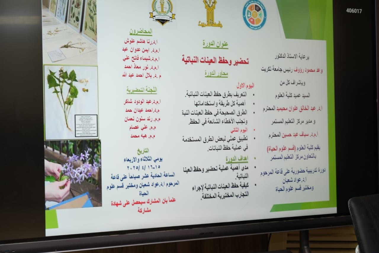 نظمت كلية العلوم قسم علوم الحياة دورة علمية "تحضير وحفظ العينات النباتية"، اذ يعتبر من المواضيع المهمة في علم النبات وعلم الأحياء بشكل عام شكلت الدورة عدة محاور اهمها