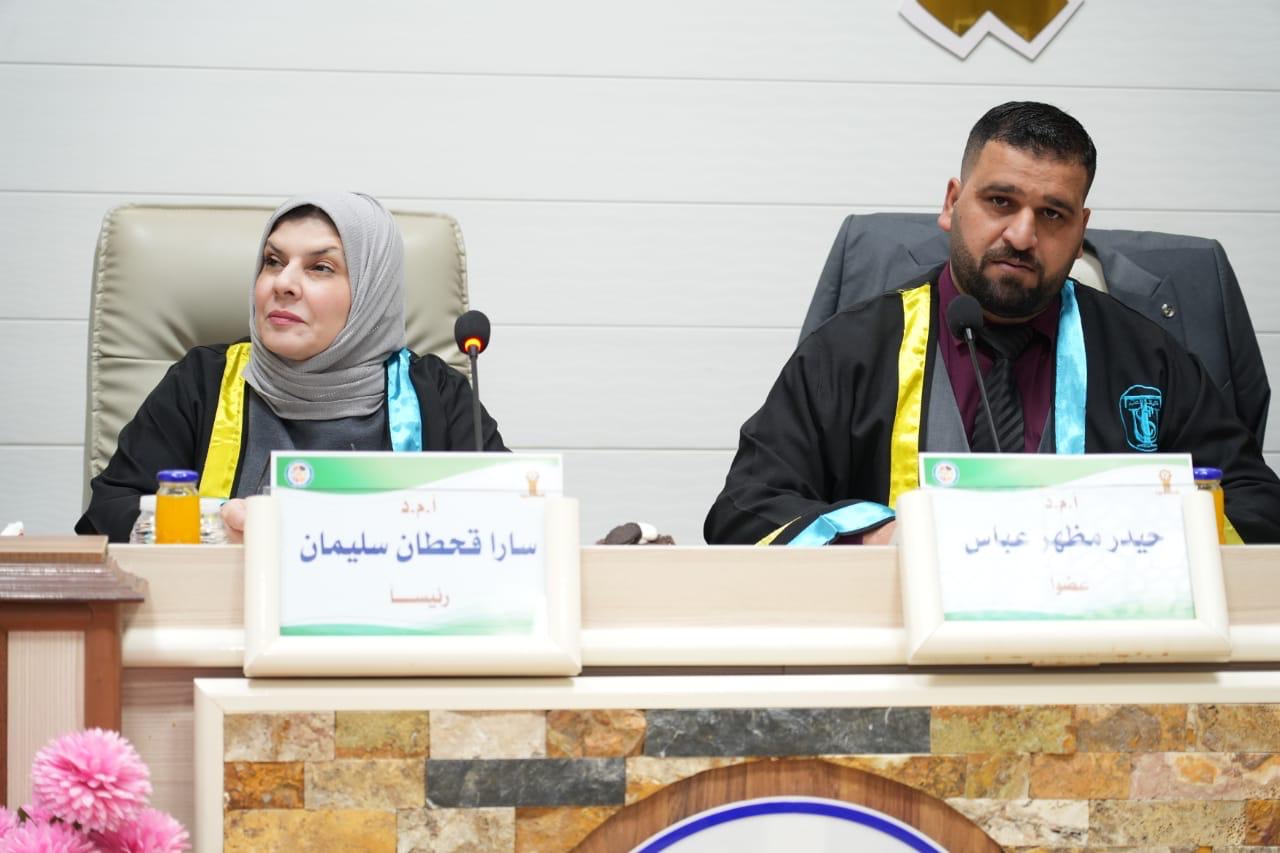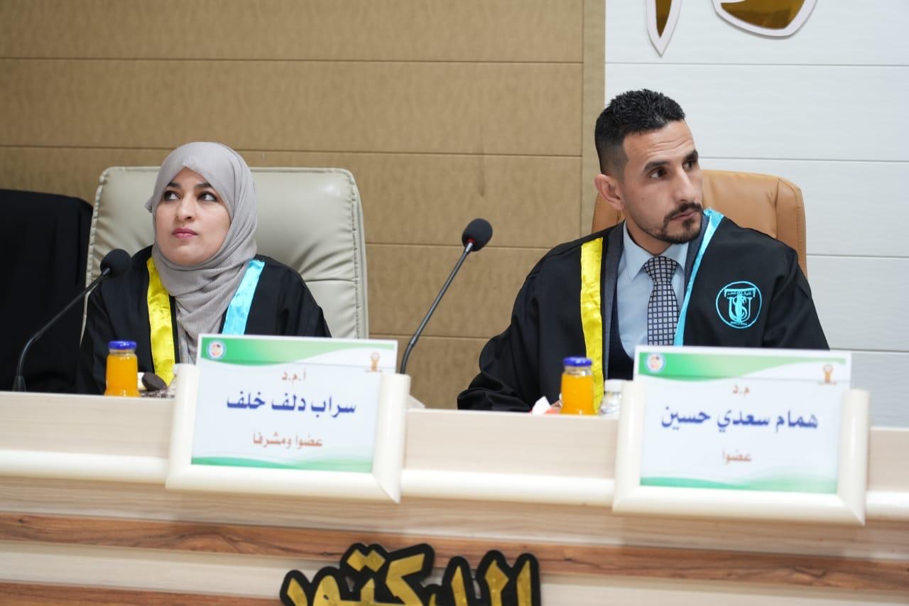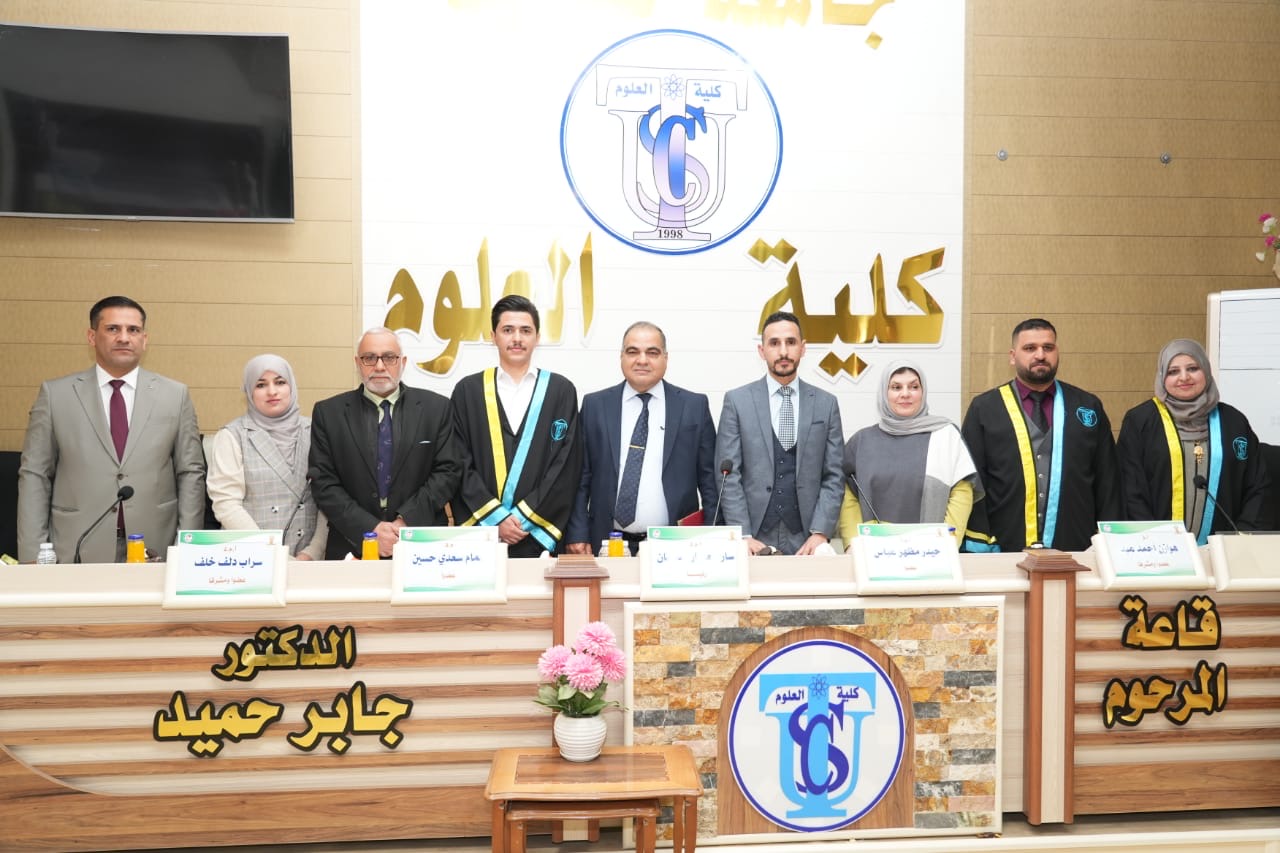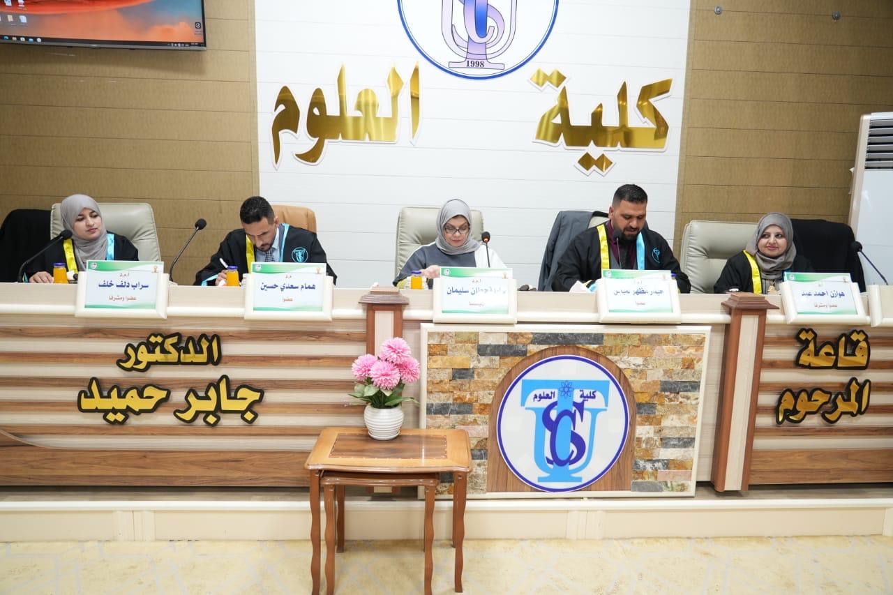 بحضور الاستاذ الدكتور حسن حسين ابراهيم مساعد رئيس الجامعة للشؤون العلمية والاستاذ الدكتور علي عبد المجيد شهاب عميد كلية التربية للعلوم الصرفة نوقشت في جامعة تكريت كلية العلوم قسم علوم الحياة رسالة الماجستير (تأثير الإصابات الجلدية بالفطريات على بعض العوامل الوراثية والمناعية) الموسومة للباحث (علي عدنان خطاب)
