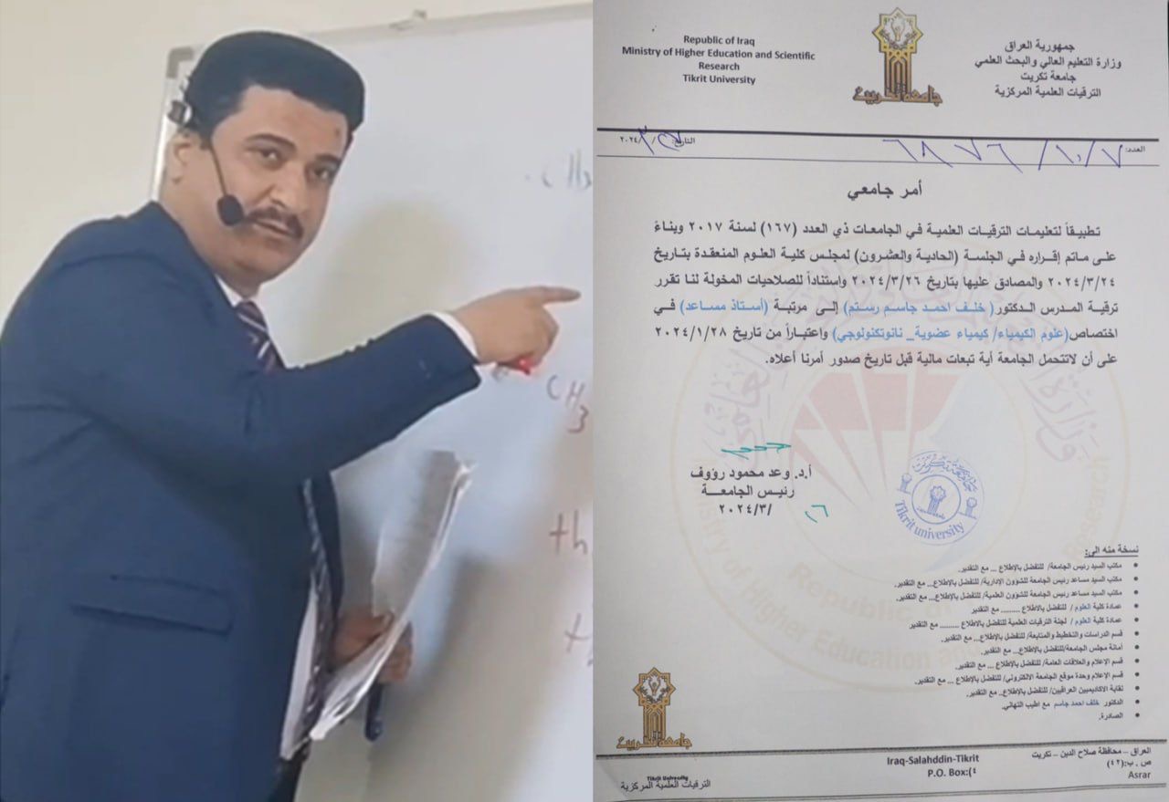 تتقدم عمادة كلية العلوم بمنتسبيها كافة متمثلة بعميدها الاستاذ الدكتور عبد الخالق علوان محيميد بأسمى آيات التهاني والتبريكات الى التدريسي الدكتور ( خلف احمد جاسم ) بمناسبة ترقيته العلمية من مرتبة ( مدرس) الى مرتبة ( استاذ مساعد) ، متمنين له وللأسرة التعليمية في صرحنا العلمي التقدم والرقي والتوفيق من أجل تعزيز المسيرة العلمية خدمة لجامعتنا و عراقنا الحبيب .