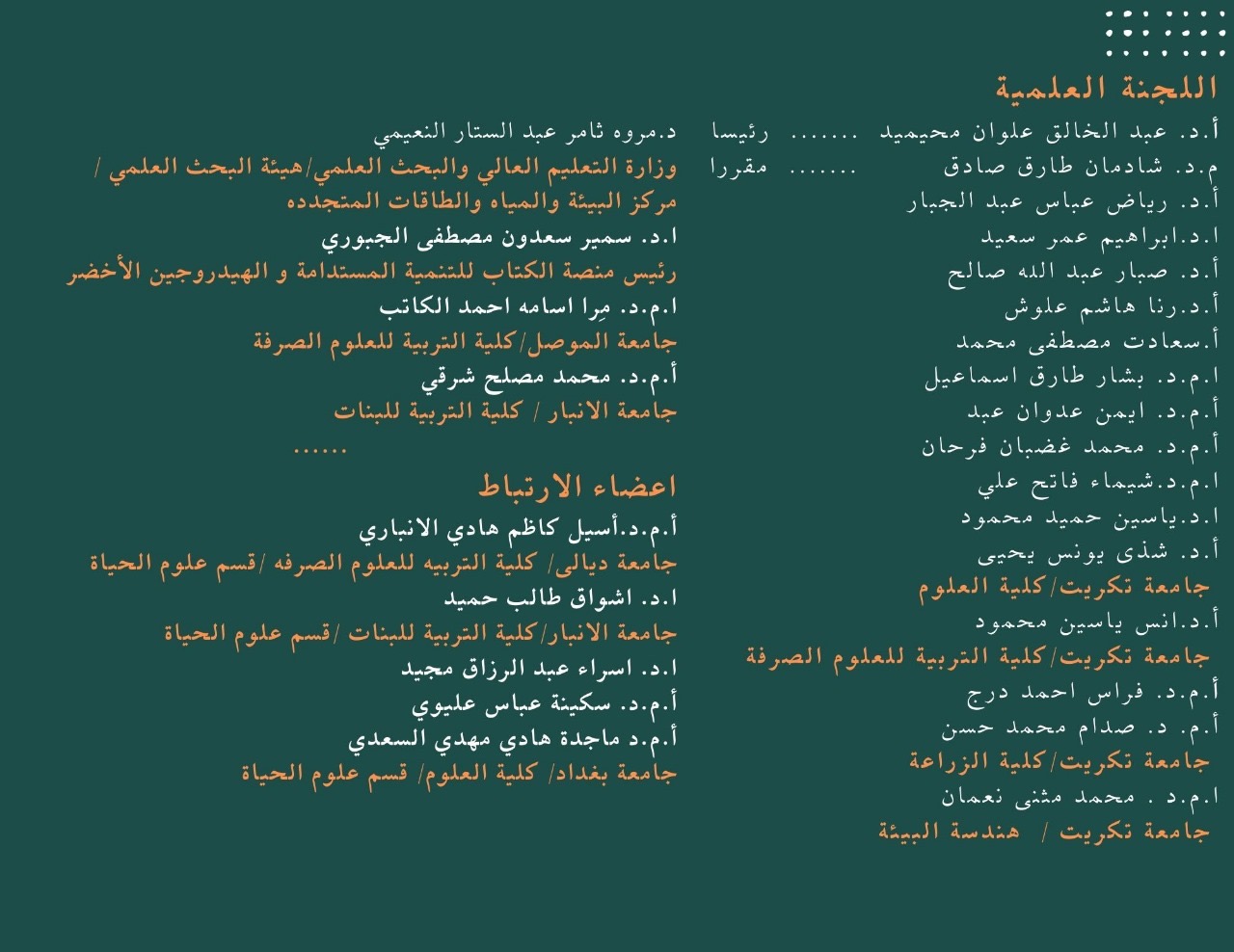يسر اللجنة التنظيمية للملتقى دعوتكم الكريمة للمشاركة في فعاليات ملتقى الاستدامة البيئية وإعادة التدوير الأول 2025، الذي سيقام في رحاب جامعة تكريت – كلية العلوم يوم الثلاثاء المصادف 2025/4/22، وذلك تحت شعار "نحو عراق أخضر ومستدام".