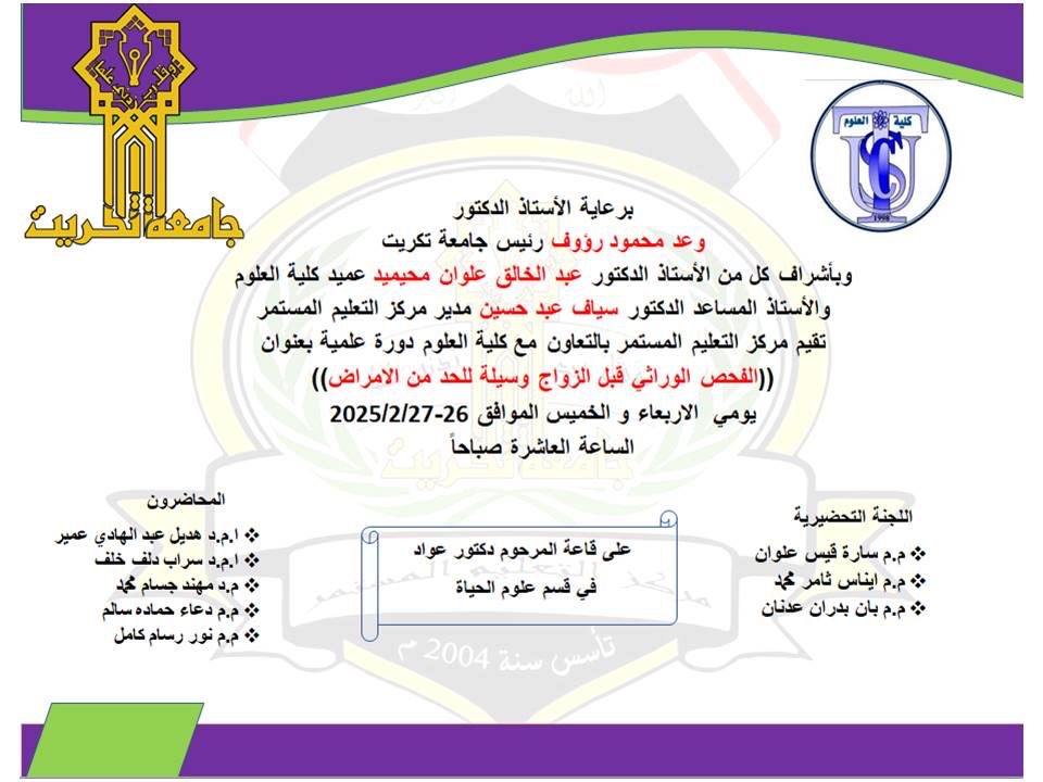 ستقام ندوة علمية بعنوان (الفحص الوراثي قبل الزواج وسيلة للحد من الامراض) صباح يوم الاربعاء والخميس الموافق 26/2/2025 الساعة العاشرة صباحاً على قاعة المرحوم الدكتور عواد شعبان في قسم علوم الحياة