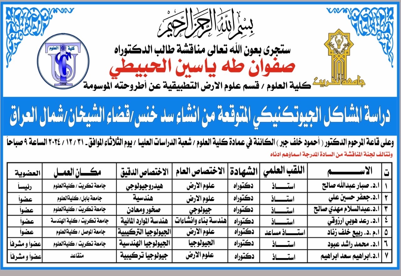 ستجري مناقشة اطروحة الدكتوراه (دراسة المشاكل الجيوتكنيكي المتوقعة من انشاء سد خنس/قضاء الشيخان/شمال العراق) الموسومة في كلية العلوم التطبيقية وعلى قاعة المرحوم الدكتور احمود خلف جبر