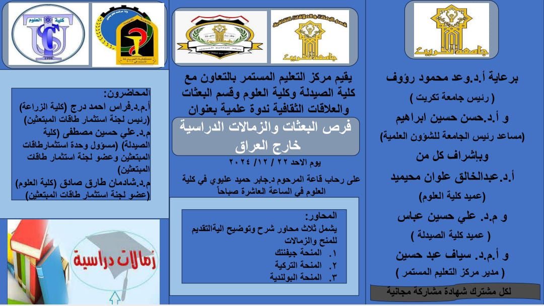 ستقام في كلية العلوم ندوة علمية بعنوان (فرص البعثات والزمالات الدراسية خارج العراق) يوم الاحد الموافق 22/12/2024 الساعة العاشرة صباحاً وعلى رحاب قاعة المرحوم الدكتور جابر حميد عليوي في كلية العلوم