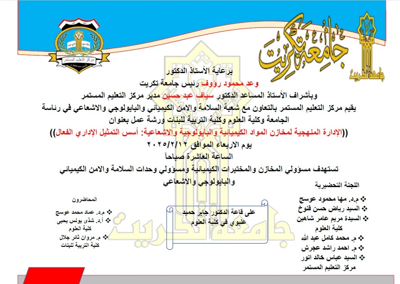 ستقام ورشة عمل بعنوان (الادارة المنهجية لمخازن المواد الكيميائية والبايولوجية والاشعاعية : اسس التمثيل الاداري الفعال) صباح يوم الاربعاء الموافق 12/2/2025 العاشرة صباحاً على قاعة الدكتور جابر حميد عليوي في كلية العلوم