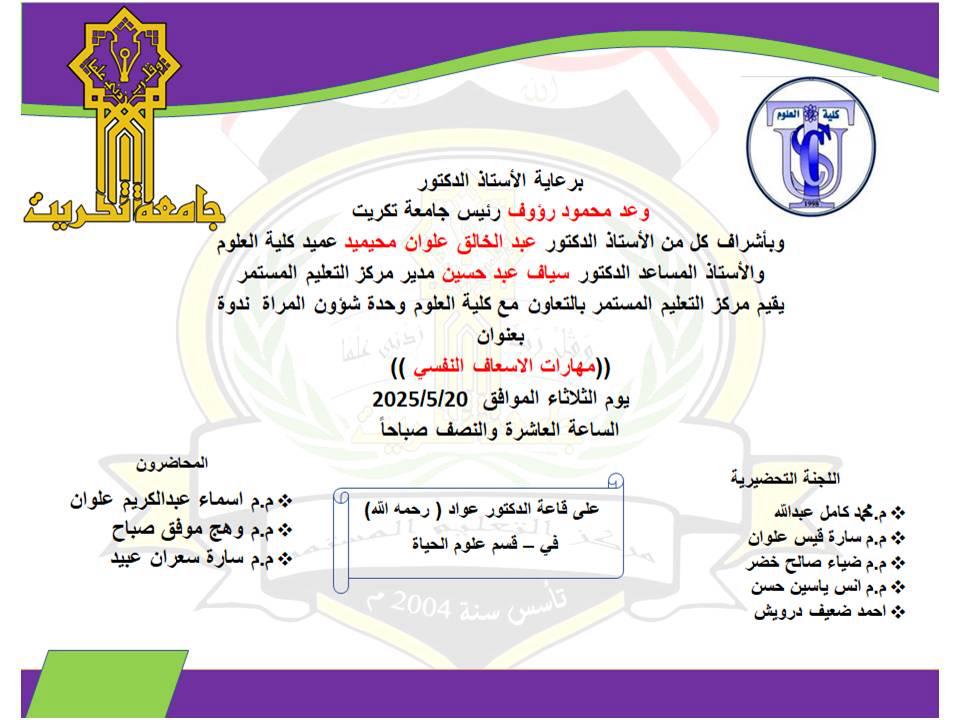 ستقام يوم الثلاثاء الموافق 20 ايار 2025 ندوة علمية بعنوان ( مهارات الاسعاف النفسي ) الساعة العاشرة والنصف صباحاً على قاعة الدكتور عواد رحمه الله بقسم علوم الحياة