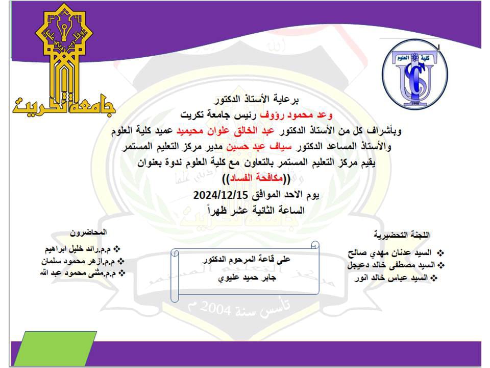 ستقام في كلية العلوم ندوة علمية بعنوان (مكافحة الفساد) يوم الاحد الموافق 15/12/2024 الساعة الثانية عشر صباحاً وعلى قاعة المرحوم الدكتور جابر حميد عليوي