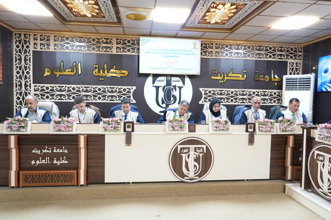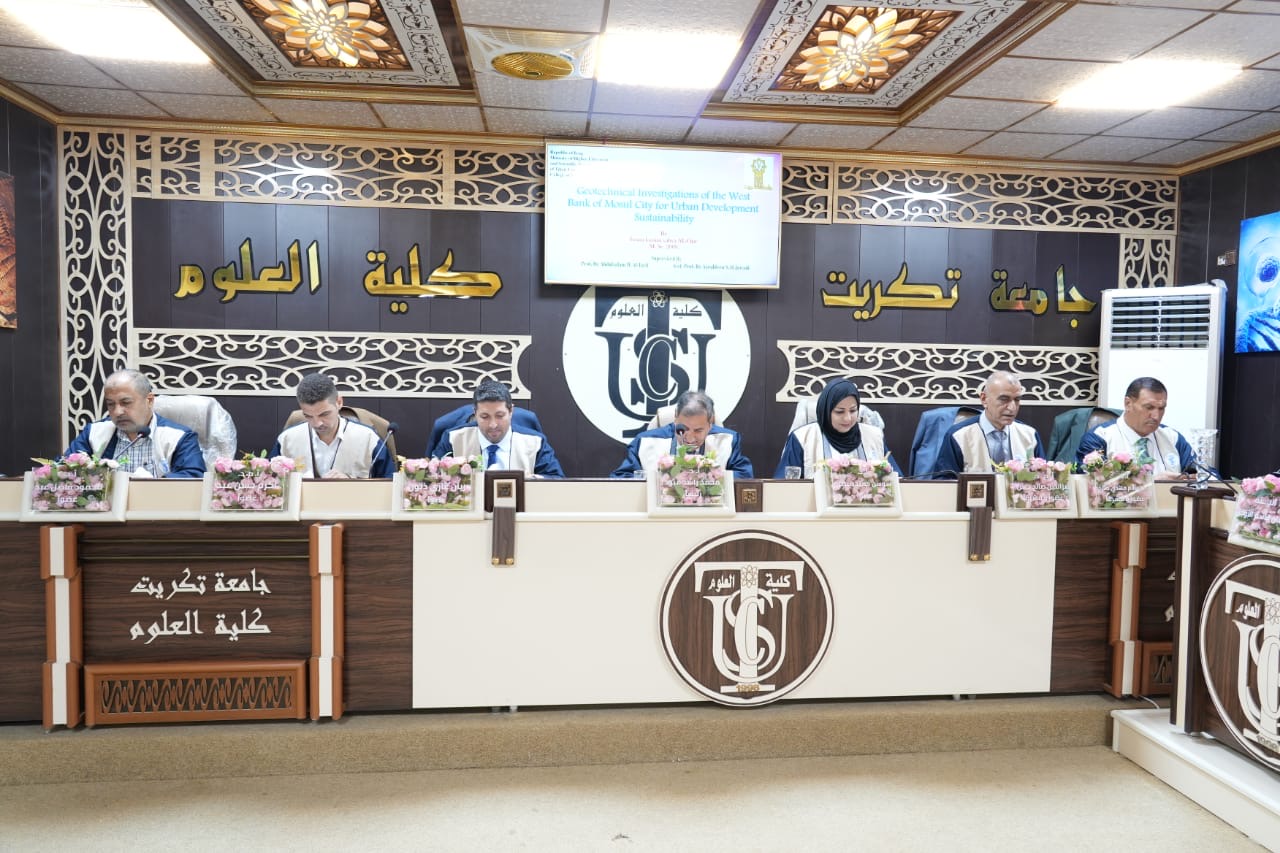 نوقشت في كلية العلوم قسم علوم الارض التطبيقية اطروحة الدكتوراه (التحريات الجيوتقنية للضفة الغربية من مدينة الموصل لاستدامة التطور العمراني) للباحثة (ايمان قاسم يحيى)