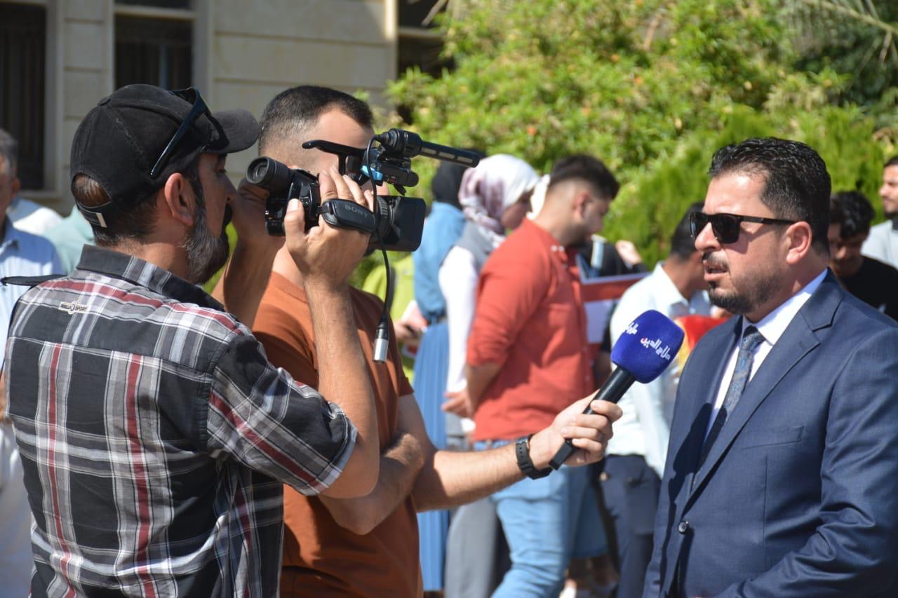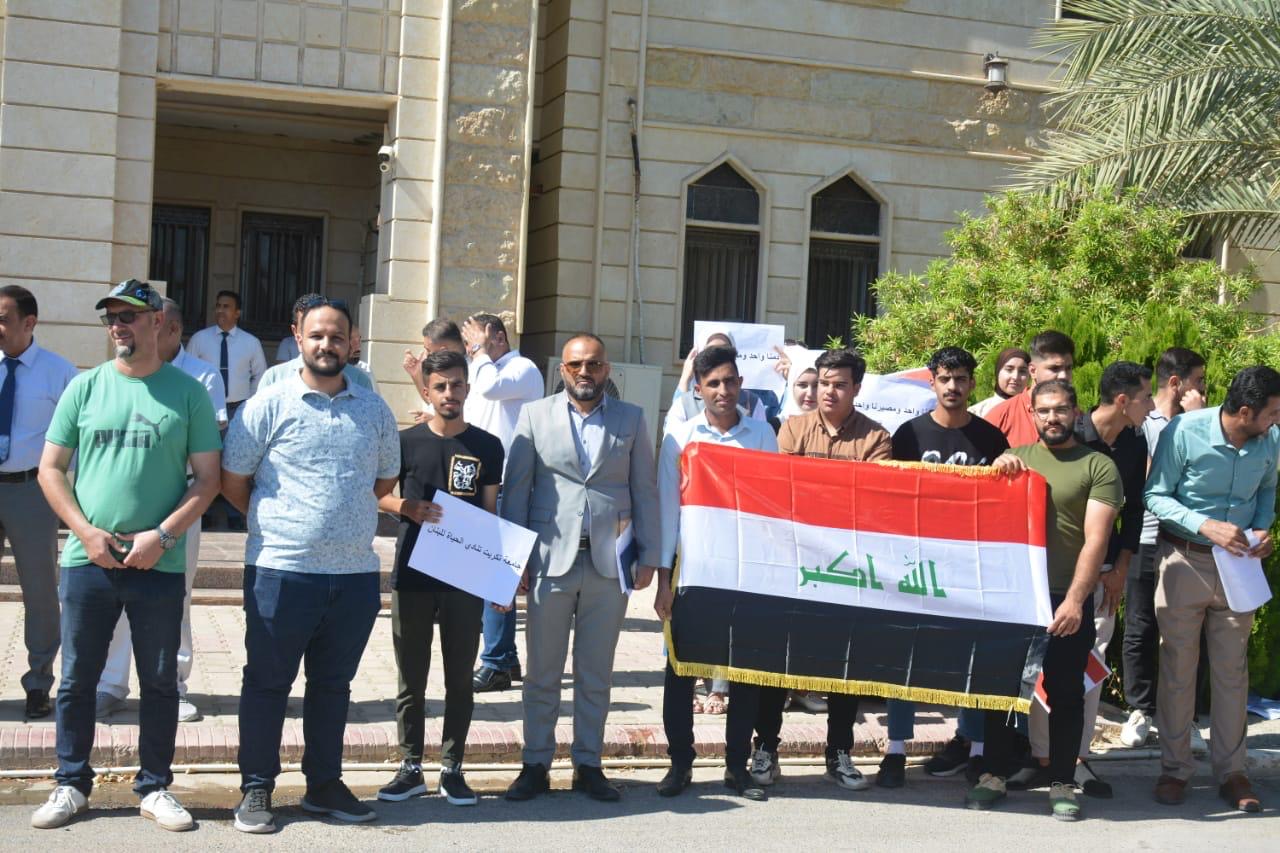 تنفيذا لتوجيهات وزارة التعليم العالي والبحث العلمي نظمت جامعة تكريت بحضور الاستاذ الدكتور وعد محمود رئيس جامعة تكريت والاستاذ الدكتور حسن حسين ابراهيم مساعد رئيس الجامعة للشؤون العلمية وعدد من السادة عمداء الكليات والموظفين والطلبة وقفة استنكارية واحتجاجية ضد العدوان الهمجي الذي يتعرض له الشعبين الفلسطيني واللبناني الشقيقيين على يد قوى الاحتلال والظلام