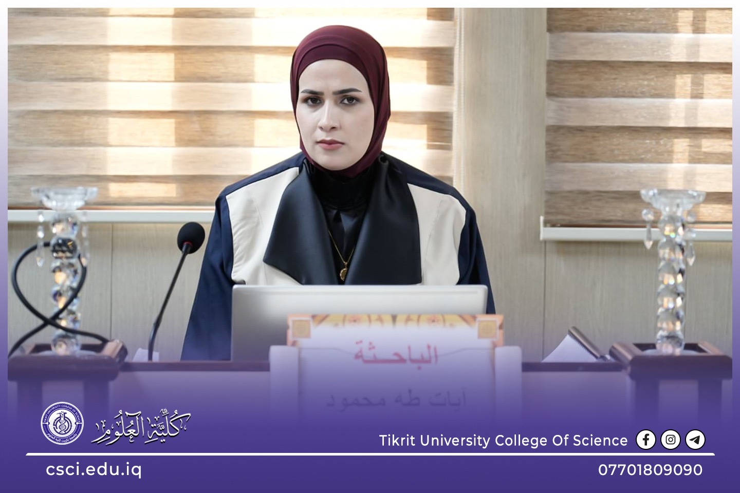 نوقشت في كلية العلوم قسم علوم الحياة رسالة الماجستير (التصنيع الحيوي للميلانين الفطري من فطر ال Aspergillus وتقييم تصنيعه وفعاليته المضادة للممرضات والاكسدة) للباحثة (ايات طه محمود)