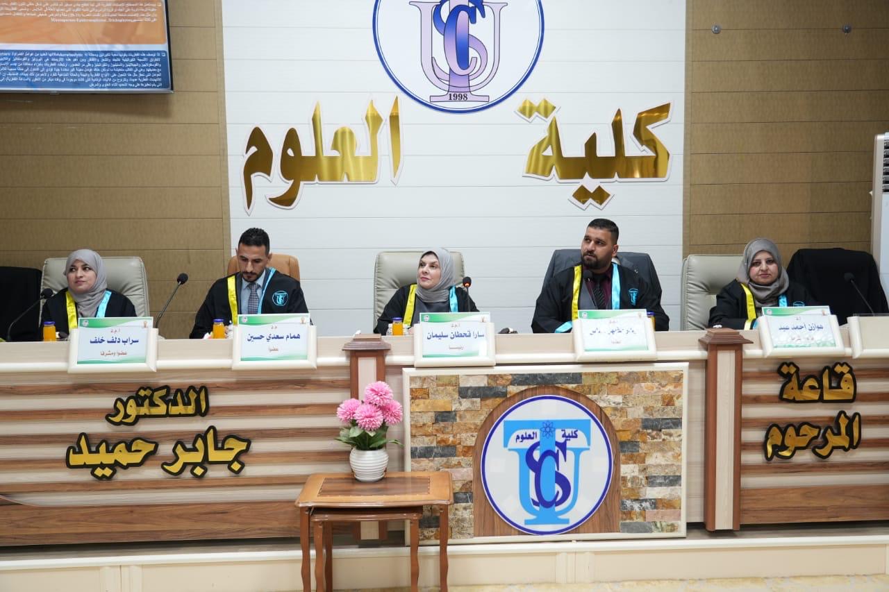 بحضور الاستاذ الدكتور حسن حسين ابراهيم مساعد رئيس الجامعة للشؤون العلمية والاستاذ الدكتور علي عبد المجيد شهاب عميد كلية التربية للعلوم الصرفة نوقشت في جامعة تكريت كلية العلوم قسم علوم الحياة رسالة الماجستير (تأثير الإصابات الجلدية بالفطريات على بعض العوامل الوراثية والمناعية) الموسومة للباحث (علي عدنان خطاب)
