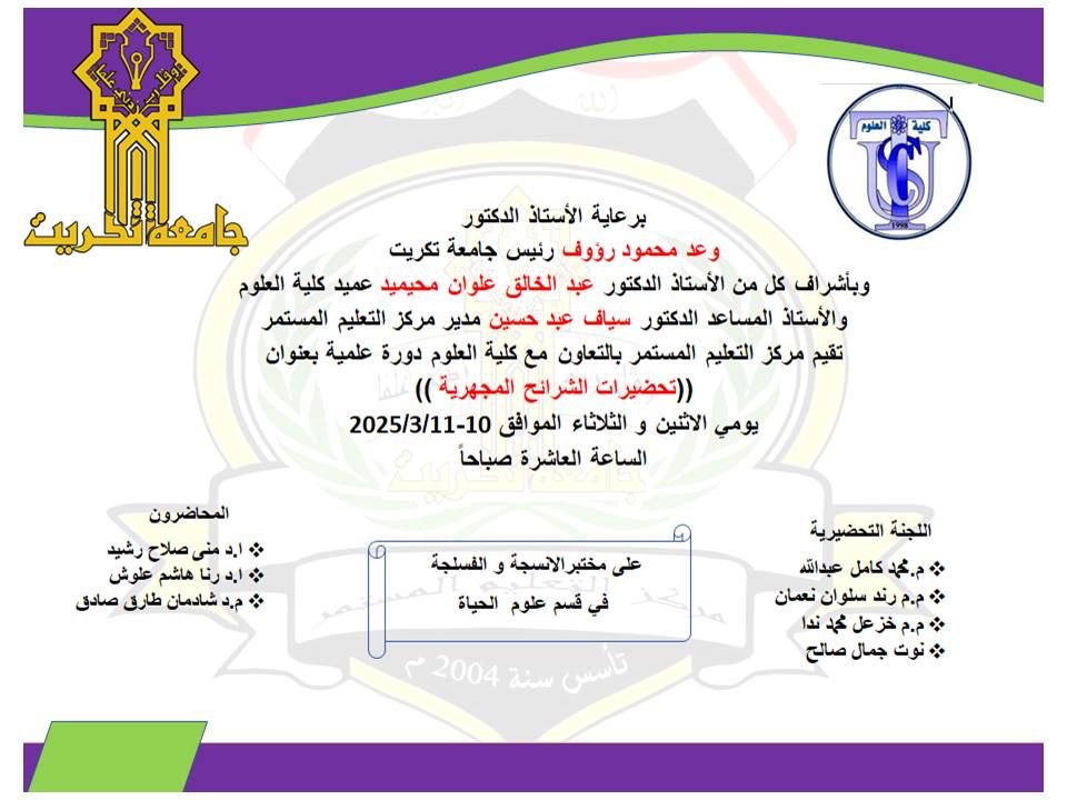 ستقام دورة علمية بعنوان (تحضيرات الشرائح المجهرية) صباح يوم الاثنين والثلاثاء الموافق 10/3/2025 الساعة العاشرة صباحاً على مختبر الانسجة والفسلجة في قسم علوم الحياة