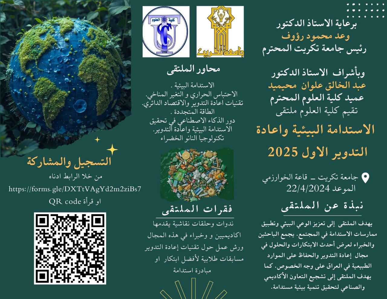 يسر اللجنة التنظيمية للملتقى دعوتكم الكريمة للمشاركة في فعاليات ملتقى الاستدامة البيئية وإعادة التدوير الأول 2025، الذي سيقام في رحاب جامعة تكريت – كلية العلوم يوم الثلاثاء المصادف 2025/4/22، وذلك تحت شعار "نحو عراق أخضر ومستدام".