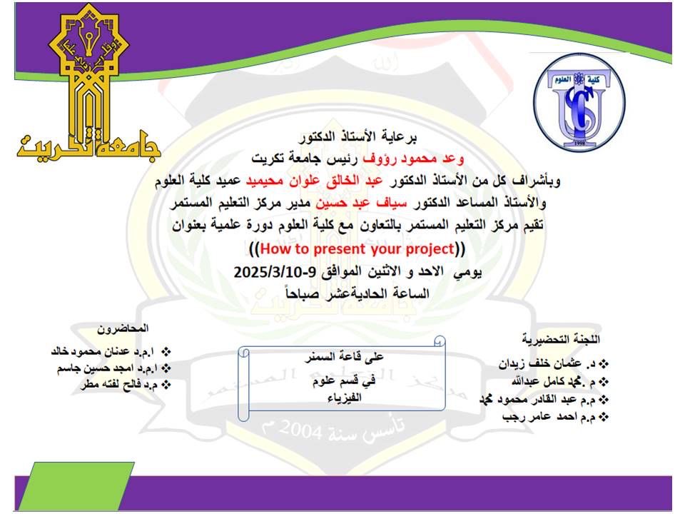 ستقام ندوة علمية بعنوان (How to present your project) صباح يوم الاحد والاثنين الموافق9/10/2025 الساعة الحادية عشر صباحاً على قاعة السمنر في قسم الفيزياء.