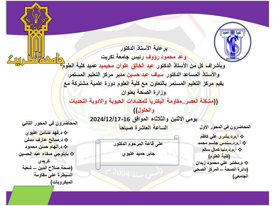 ستقام في كلية العلوم دورة علمية بعنوان (مشكلة العصر..مقاومة البكتريا للمضادات الحيوية والادوية التحديات والحلول) يوم الاثنين الموافق 16/12/2024 الساعة العاشرة صباحاً وعلى قاعة المرحوم الدكتور جابر حميد عليوي