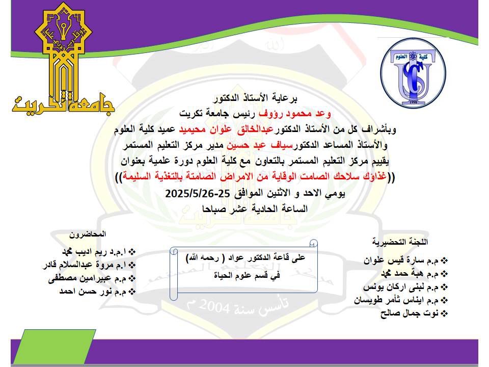 ستقام يوم الاحد والاثنين الموافق 25 و 26 ايار 2025 دورة علمية بعنوان ( غذاؤك سلاحك الصامت الوقاية من الامراض الصامتة بالتغذية السليمة ) الساعة الحادية عشر صباحاً على قاعة الدكتور عواد رحمه الله بقسم علوم الحياة