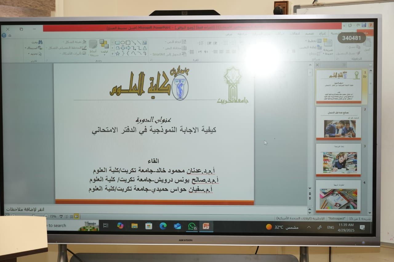 تزامناً مع اقتراب موعد الامتحانات النهائية للفصل الدراسي الثاني 2024-2025 اقام قسم الفيزياء دورة تدريبية في كلية العلوم جامعة تكريت بالتعاون مع مركز التعليم المستمر بعنوان (كيفية الاجابة النموذيجية في الدفتر الامتحاني)