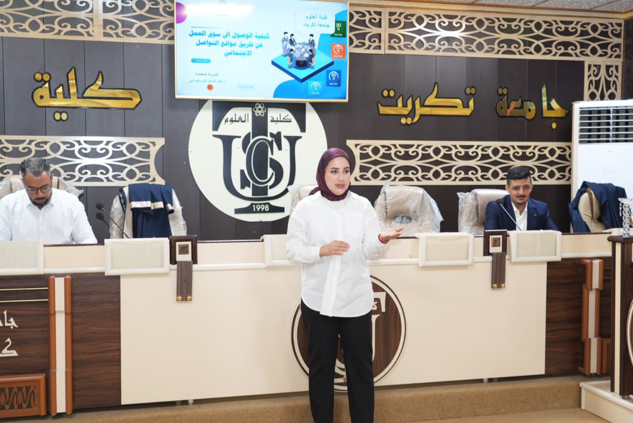استقبل الاستاذ الدكتور عبد الخالق علوان محيميد عميد كلية العلوم الاستاذ الدكتور وعد محمود رؤوف رئيس جامعة تكريت وحضرو كل الجانبين ورشة عمل بعنوان (كيفية الوصول الى سوق العمل عن طريق مواقع التواصل الاجتماعي) عقدتها كلية العلوم بالتعاون مع شعبة التأهيل والتوظيف والمتابعة في رئاسة الجامعة استهدفت طلبة المرحلة الرابعة والخريجين القى محاورها السيد اسامة محمد عبدالله من رئاسة الجامعة والمدربة المعتمدة السيدة رغد أحمد السامرائي