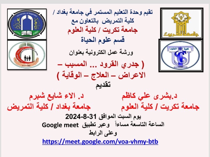 في إطار التعاون بين الجامعات العراقية نظم قسم علوم الحياة في كليتنا بالتعاون مع وحدة التعليم المستمر بكلية التمريض جامعة بغداد ورشة عمل الكترونية بعنوان (مرض جدري القرود ... المسبب – الاعراض – العلاج – الوقاية) في يوم السبت الموافق 31/8/2024 م وعلى برنامج google meet. حاضرت في الورشة الدكتورة بشرى علي كاظم التدريسية في كلية العلوم / جامعة تكريت والدكتورة آلاء شايع شبرم التدريسية في كلية التمريض / جامعة بغداد ، هدفت الورشة الى التعريف بمرض جدري القرود والمسبب المرضي له والاعراض التي تظهر على المصاب وكيفية التشخيص والوقاية .
